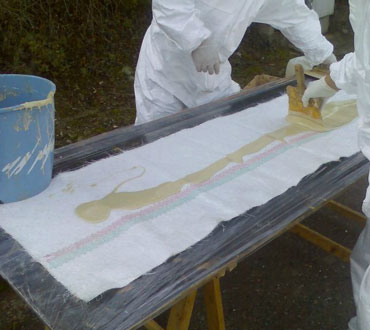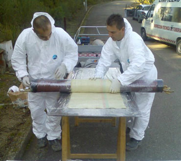 Con un proceso muy simple se coloca un encamisado compuesto de lámina de fibra de vidrio impregnada de resina en el interior de la tubería, justo en la zona defectuosa, mediante un packer neumático especial y controlado por un equipo de inspección TV.